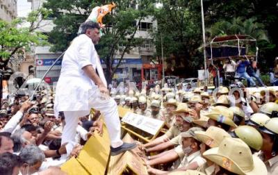 KPCC President DK Shivakumar climbed a barricade during a protest rally demanding the removal of BJP Minister KS Eshwarappa from the Karnataka government, Rural Development and Panchayath Raj Minister KS Eshwarappa has been accused of corruption that allegedly led to the suicide of civil contractor Santosh Patil, in Bengaluru on Thursday 14th April 2022