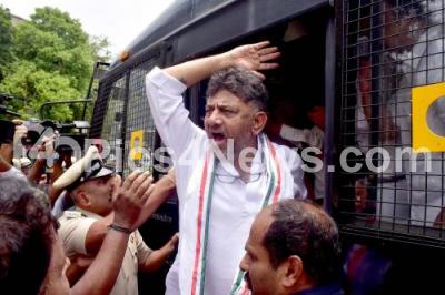 Photo Caption : KPCC President DK Shivakumar being detained by Police during a protest rally demanding the removal of BJP Minister KS Eshwarappa from the Karnataka government, Rural Development and Panchayath Raj Minister KS Eshwarappa has been accused of corruption that allegedly led to the suicide of civil contractor Santosh Patil, in Bengaluru on Thursday 14th April 2022