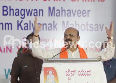 Photo Caption : Chief Minister of Karnataka Basavaraj Bommai addressing during "Bhagwvan Mahveer Jayanti 2022" celebrations at Maratha Hostel, in Bengaluru on Thursday 14th April 2022