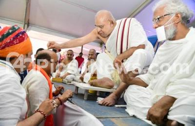 Photo Caption : Jain Muni blessing Chief Minister of Karnataka Basavaraj Bommai during "Bhagwvan Mahveer Jayanti 2022" celebrations at Maratha Hostel, in Bengaluru on Thursday 14th April 2022