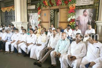 Photo Caption : KPCC President DK Shivakumar with CLP Leader and Former CM Siddaramaiah and Congress leaders staging a protest at Vidhana Soudha premises against KS Eshwarappa, in Bengaluru on Friday 15th April 2022