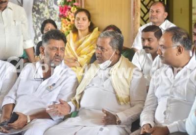 Photo Caption : KPCC President DK Shivakumar with CLP Leader and Former CM Siddaramaiah and Congress leaders staging a protest at Vidhana Soudha premises against KS Eshwarappa, in Bengaluru on Friday 15th April 2022