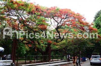Photo Caption : Gulmohar Flower blooming at Cubbon Park attracts the people, in Bengaluru on Sunday 17th April 2022
