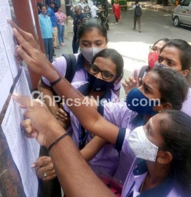 Photo Caption : 2nd PUC Students checking their registration number before the exam at Sheshadripuram college, 2nd PUC exams have started from today statewide, in Bengaluru on Friday 22nd April 2022