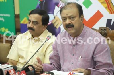 Minister Narayana Gowda with K Govindraj, Vice President of Indian Olympic Association and others addressing a press conference on "Khelo India University Games” at Vidhana Soudha, in Bengaluru on Friday 22nd April 2022