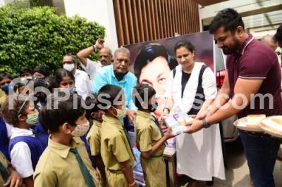 Event Description : Ashwini Puneeth Rajkumar with Bagmane Vinay Revanath and Bharatinagar Residents Forum President, N S Ravi distributing free note books to school children to mark the 94th birth anniversary of Dr Rajkumar at Sadashiva Nagar, in Bengaluru on Saturday 23rd April 2022