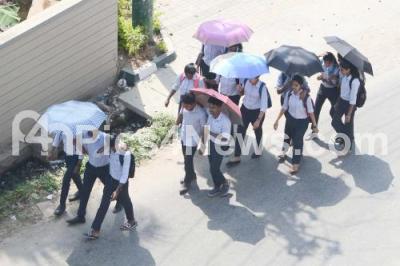 Photo Caption : College Students using umbrellas to protect themselves from the sun, as the temperatures have been soaring high in the city, in Bengaluru on Monday 25th April 2022