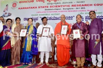 Photo Caption : Dr. Panditharadhya Shivacharya Swamiji of Taralabalu Shaka Mata with Scientist Dr. AS Kirankumar, Former Chairman ISRO, Dr. Hulikal Nataraj, BS Paramashivaiah, President, Veerashyva Lingaytha Development Board , Dr. Vijayalakshmi Balekundri and others during state level "Kayakayogi - 2022" award presentation program organised by Karnataka State Scientific Research Council at Vijaya Nagar, in Bengaluru on Sunday 1st May 2022