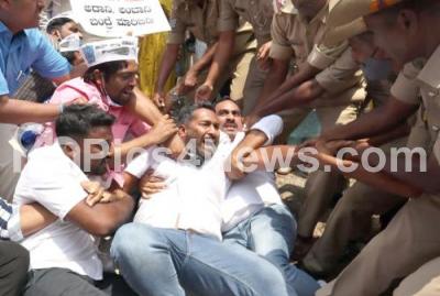 Photo Caption : Members of Aam Aadmi Party detained by police personnel during their protest against KPSC corruption at Freedom Park, in Bengaluru on Wednesday 4th May 2022