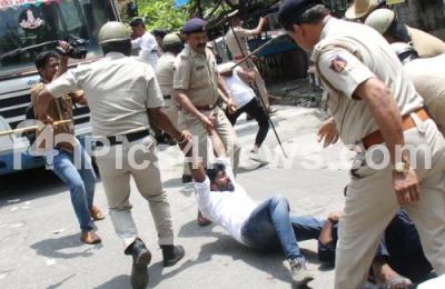 Police personnel detained NSUI members during their protest against PSI exam scam and Minister Ashwath Narayana, in Bengaluru on Wednesday 4th May 2022