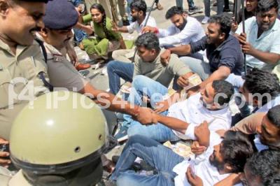Photo Caption : Police personnel detained NSUI members during their protest against PSI exam scam and Minister Ashwath Narayana, in Bengaluru on Wednesday 4th May 2022