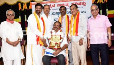 Photo Caption : Dr Mahesh Joshi, President Kannada Sahitya Parishat with Dr Harikrishna and others presented Centenary Celebration Datti Award to Dr RK Nallur Prasad during the 108th Foundation Day celebrations of Kannada Sahitya Parishat, in Bengaluru on Thursday 5th May 2022