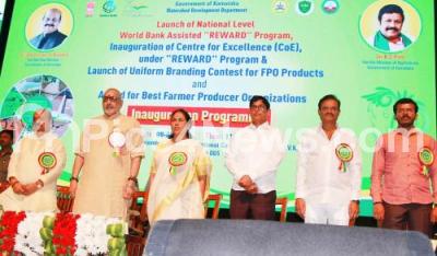 Photo Caption : Giriraj Singh, Union Minister of Rural Development and Panchayati Raj Department with Shobha Karandlaje, Ministry of Agriculture and Farmers Welfare, CM Basavaraj Bommai, Minister Munirathna and others during launch of National level World Bank Assisted "Reward" program, inauguration of Centre for Excellence under "Reward" program and launch of Uniform Branding contest for FPO products and Award presentation to Best Farmer Producer Organizations at GKVK campus, in Bengaluru on Sunday 8th May 2022