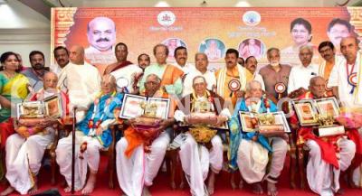 Photo Caption : Brahamana pandits felicitated during inauguration of Acharya Atreya Jayantotsava and various developments projects at Vidhana Soudha, also seen are Ministers BC Nagesh, Govind M Karjol, MLA Ravi Subramanya, Brahmana Development Board President, Sachidananda Murthy and others , in Bengaluru on Tuesday 10th May 2022
