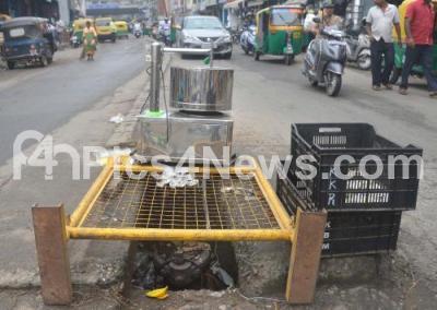 Photo Caption : Pothole road being covered with barricade and grinder at Chickpet, in Bengaluru on Tuesday 10th May 2022