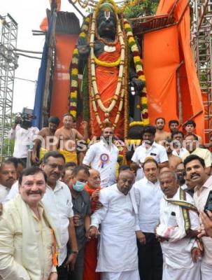 Event Description : Former PM HD Devegowda inaugurated the 21 feet tall monolith Anjeneya statue at Gali Anjaneya Temple premises, Mysrur Road, also seen are Former Minister M Krishnappa and others, in Bengaluru on Wednesday 11th May 2022