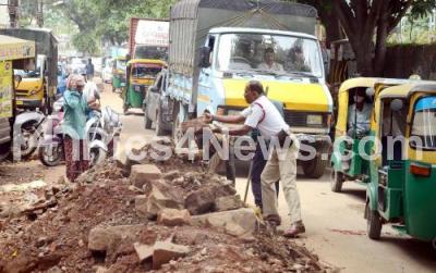 Event Description : A traffic police removing stones on the road to make way for the vehicles to move smoothly, in Bengaluru on Friday 13th May 2022