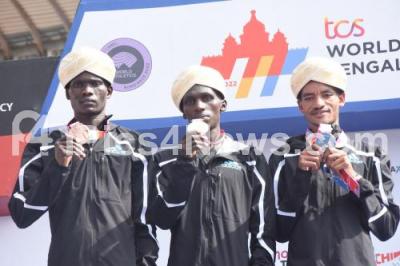 Photo Caption : International athletes 1st runner up Kipkorir from Ethiopia, 2nd runner up Tades Worku from Kenya and 3rd runner up Kibiwott Kandie pose after winning the TCS World 10K Marathon in the Elite men Category at Kanteerava Stadium, in Bengaluru on Sunday 15th May 2022
