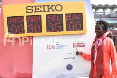 Photo Caption : International athlete 1st runner up Cheptai from Kenya poses near the time record tracker, winning the TCS World 10K Marathon in the Elite women Category at Kanteerava Stadium, in Bengaluru on Sunday 15th May 2022
