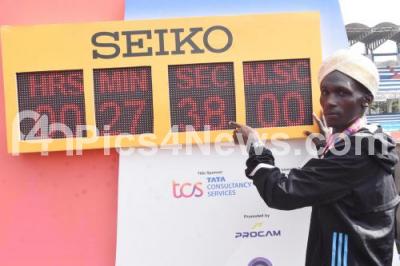 Photo Caption : International athlete 1st runner up Nicholas Kipkorir from Ethiopia poses near the time record after winning the TCS World 10K Marathon in the Elite men Category at Kanteerava Stadium, in Bengaluru on Sunday 15th May 2022