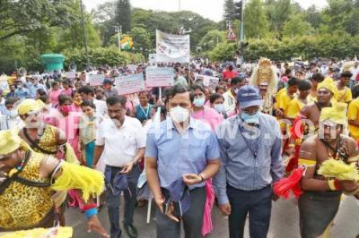 Photo Caption : Ravindra, Commissioner, Family and Health welfare Dept with Dr. Trilokachandra, BBMP Health Dept. Special Commissioner, Dr. Ravikumar and others during an awareness rally on dengue fever on the occasion of National Dengue Day, in Bengaluru on Monday 16th May 2022