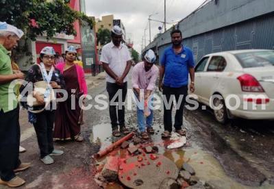 Event Description : Members of the AAM AADMI PARTY (AAP) staged a unique protest demonstration performing Puja to huge potholes at Bellandur Ward, the protest was against BBMP for not filling the potholes, in Bengaluru on Sunday 22nd May 2022