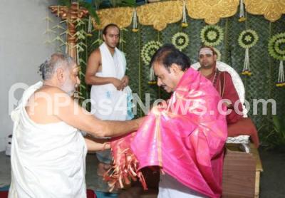 Sri Vidhushekara Bharati Swami of Sringeri Mutt blessed Minister Munirathna during Kumbhabhishekam of Sri Shanmuga Temple at BEML layout, in Bengaluru on Sunday 22nd May 2022