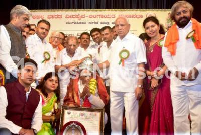 Photo Caption : Former CM BS Yediyurappa presenting "Sri Hangal Kumareshwara" award to Former Minister Dr. Bhimanna Khandre during a program organised by Akhila Bharata Veerashyva Lingayuta Mahasabha at Ravindra Kalakshetra, also seen are Dr. Shamanuru Shivashankarappa, Eshwar Khandre, Dr. N Thippanna and others, in Bengaluru on Sunday 22nd May 2022