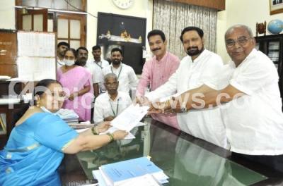 Photo Caption : BJP MLC candidate Laxman Savadi submitted his nomination form to Election officer at Vidhana Soudha, also seen are BJP State President Nalin Kumar Kateel and Minister Umesh Katti , in Bengaluru on Tuesday 24th May 2022