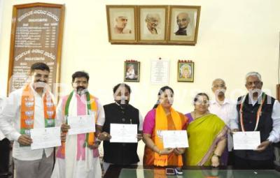 Photo Caption : Electoral Officer Vishalakshi presenting unanimous selection certificates to Sharavana, Keshava Prasad, Chalavadi Narayanswamy, Hemalatha Nayak and Nagaraj Yadav at Vidhana Soudha, in Bengaluru on Friday 27th May 2022