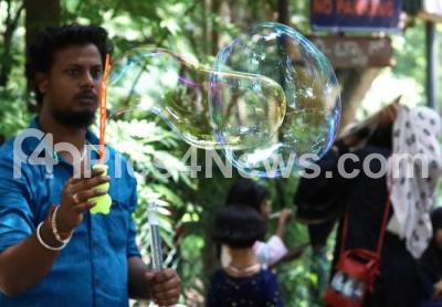 Photo Caption : A salesman blowing and selling soap bubbles with bubble blower at Cubbon Park, in Bengaluru on Sunday 5th June 2022