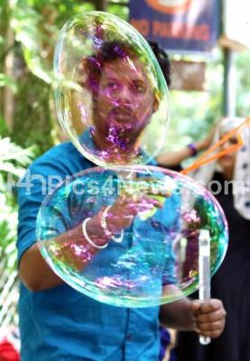 A salesman blowing and selling soap bubbles with bubble blower at Cubbon Park, in Bengaluru on Sunday 5th June 2022