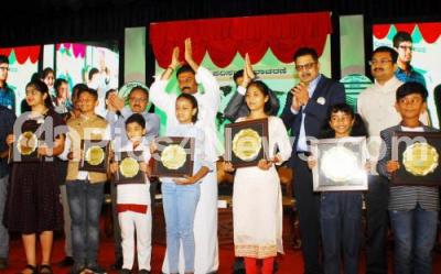 Photo Caption : Minister Anand Singh presenting prizes to winners of the drawing competition during the "World Environment Day" at Jnanajyothi Auditorium, in Bengaluru on Sunday 5th June 2022