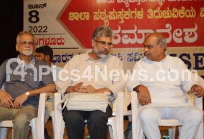 Prof SG Siddaramaiah with Prof Allamaprabhu Bettaduru, Dr Mudnakudu Chinnaswamy and others seen at the convetion against distortion of school text books and demand for scrapping the controversial Re revised text books and continue the old text books for the academic year, organised by All India Save Education Committee at Kondajji Basappa Auditorium, in Bengaluru on Wednesday 8th June 2022