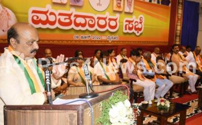 Photo Caption : CM Basavaraj Bommai with Minister ST Somashekar, BJP State President Naleen Kumar Kateel and BJP leaders during Voters meeting, in Mysuru on Wednesday 8th June 2022