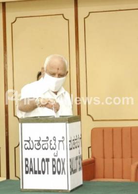 Photo Caption : Former Chief Minster BS Yediyurappa cast his vote during Rajya Sabha elections at Vidhana Soudha, in Bengaluru on Friday 10th June 2022