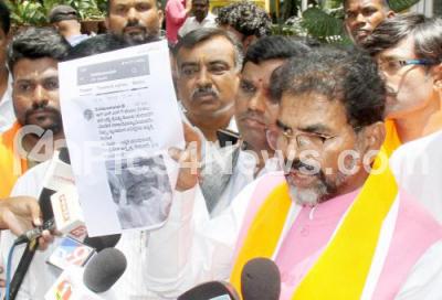 Photo Caption : BJP MLC Chalavadi T Narayanswamy showing complaint copy after giving complaint against Congress CLP leader and Former CM Siddaramaiah at High Grounds Police station, in Bengaluru on Friday 17th June 2022