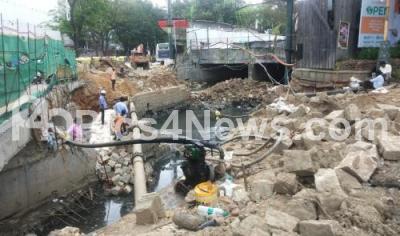 Photo Caption : Drainage work in progress at Sampige Road, Malleshwaram, has been delayed and causing problems to the motorists and pedestrians, in Bengaluru on Sunday 19th June 2022