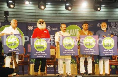 Photo Caption : CM Basavaraj Bommai with Former CM BS Yediyurappa, Ministers Sudhakar, BC Nagesh and Sadhguru Jaggi Vasudev during Save Soil rally , in Bengaluru on Sunday 19th June 2022