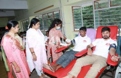 Photo Caption : Tara Anuradha, Chairman, Karnataka Forest Development Corporation interacting with blood donors during Blood donation camp at KDFC , in Bengaluru on Wednesday 22nd June 2022