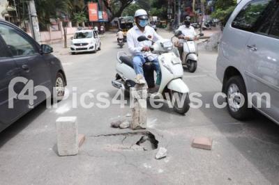 Photo Caption : Pothole road has been causing major inconvenience to people and motorists at Basaveshwara Nagar Main road, in Bengaluru on Tuesday 28th June 2022