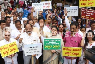 Photo Caption : MLA Sowmya Reddy with Congress leaders protesting against BBMP ward delimitation at Jayanagar, in Bengaluru on Wednesday 29th June 2022