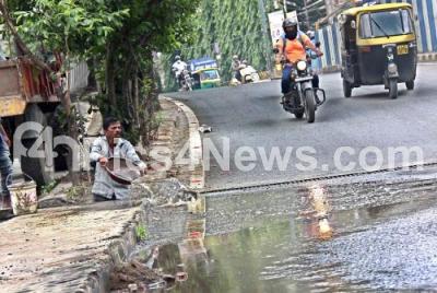 Photo Caption : A BBMP worker removing rain water logged in the drainage at Gopala Pura, Rajajinagar, in Bengaluru on Thursday 30th June 2022