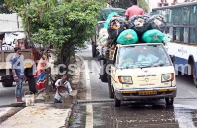Photo Caption : A BBMP worker removing rain water logged in the drainage at Gopala Pura, Rajajinagar, in Bengaluru on Thursday 30th June 2022