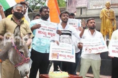 Photo Caption : Members NSUI (National Students Union of India) celebrated Education Minister BC Nagesh birthday with donkey during their protest against Minister BC Nagesh for approving new Kannada syllabus, in Bengaluru on Friday 1st July 2022