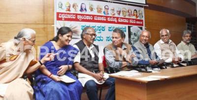 Photo Caption : Justice Nagamohan Das with Prof. Baraguru Ramachandrappa, Prof. Rajappa Dalavai, KR Sowmya, Dr. Niranjan Aradhya, Former Minister BT Lalitha Nayak during seminar on new Text book revision at Gandhi Bhavan , in Bengaluru on Wednesday 6th July 2022