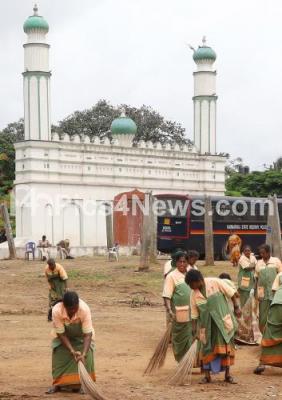 Photo Caption : BBMP workers cleaning and tight police security at Chamarajpet Eidgah ground following the controversy regarding Chamarajpet Eidgah ground on the eve of Bakrid Festival, in Bengaluru on Saturday 9th July 2022