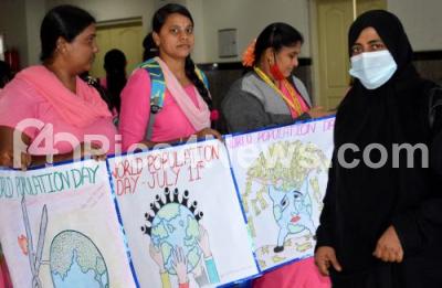 Photo Caption : Asha workers and members of Department of Health and Family Welfare participated in a awareness campaign on the occasion of World Population Day at Bangalore Medical College, in Bengaluru on Monday 11th July 2022