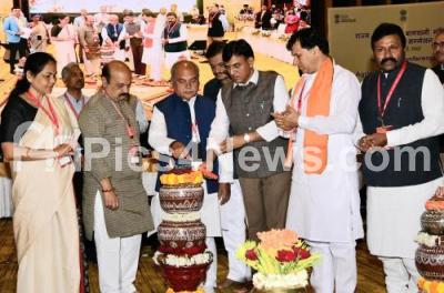 Event Description : Chief Minister of Karnataka Basavaraj Bommai with Union Agriculture and Farmers Welfare Minister Narendra Singh Tomar, Union Health and Fertilizers and Chemicals Minister Mansukh Mandaviya, Union Agriculture Minister Shobha Karandlaje, Union Minister of State for Agriculture and Farmers Welfare Kailash Choudhary during inauguration of "National Conference of State Agriculture and Horticulture " at a private hotel, in Bengaluru on Thursday 14th July 2022