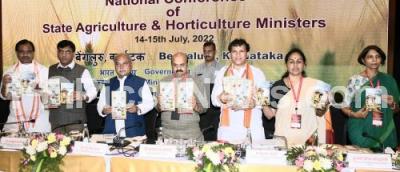 Photo Caption : Chief Minister of Karnataka Basavaraj Bommai with Union Agriculture and Farmers Welfare Minister Narendra Singh Tomar, Union Health and Fertilizers and Chemicals Minister Mansukh Mandaviya, Union Agriculture Minister Shobha Karandlaje, Union Minister of State for Agriculture and Farmers Welfare Kailash Choudhary during inauguration of "National Conference of State Agriculture and Horticulture " at a private hotel, in Bengaluru on Thursday 14th July 2022